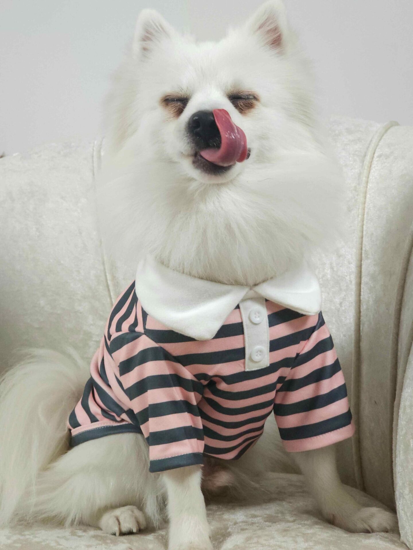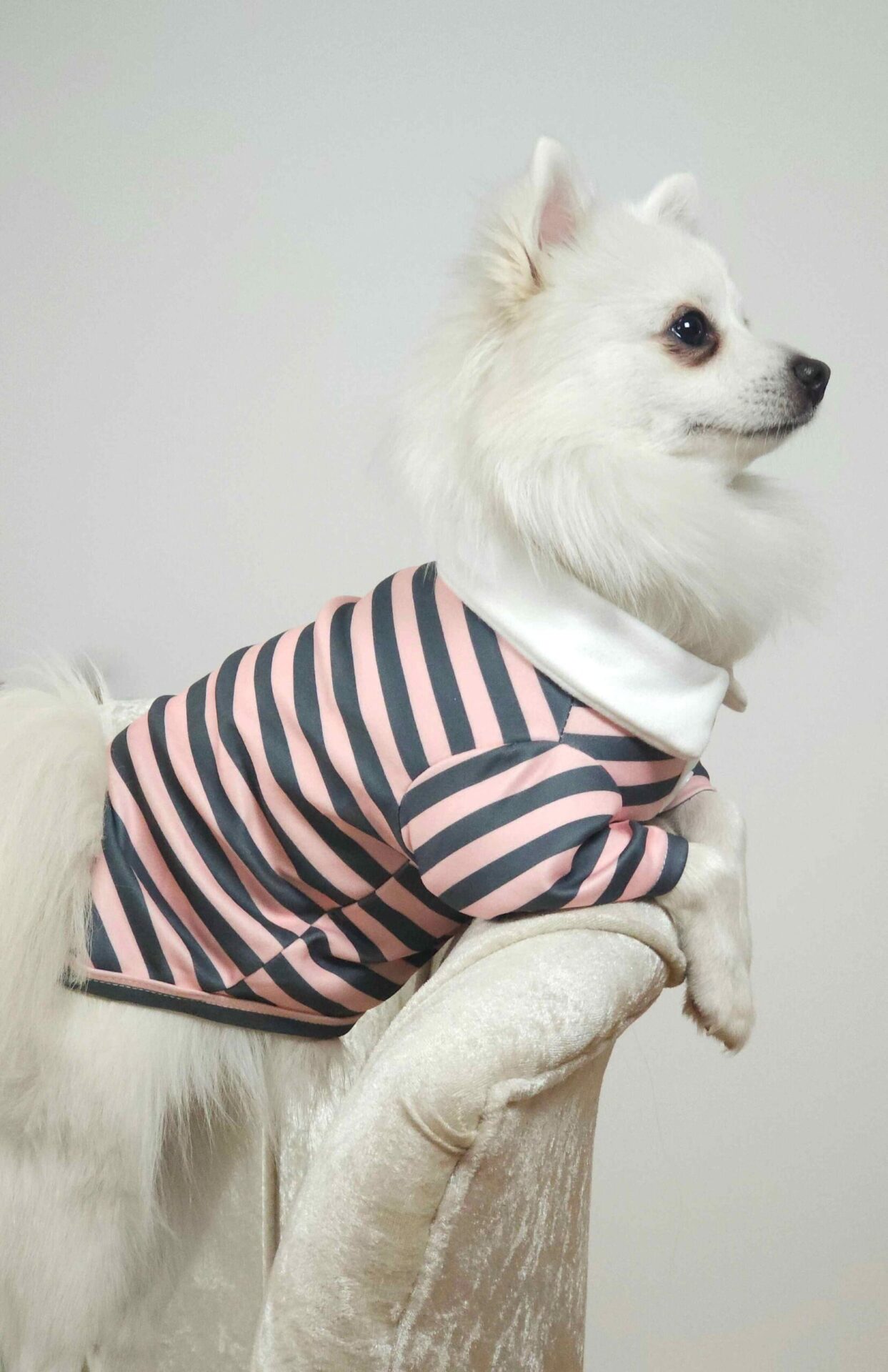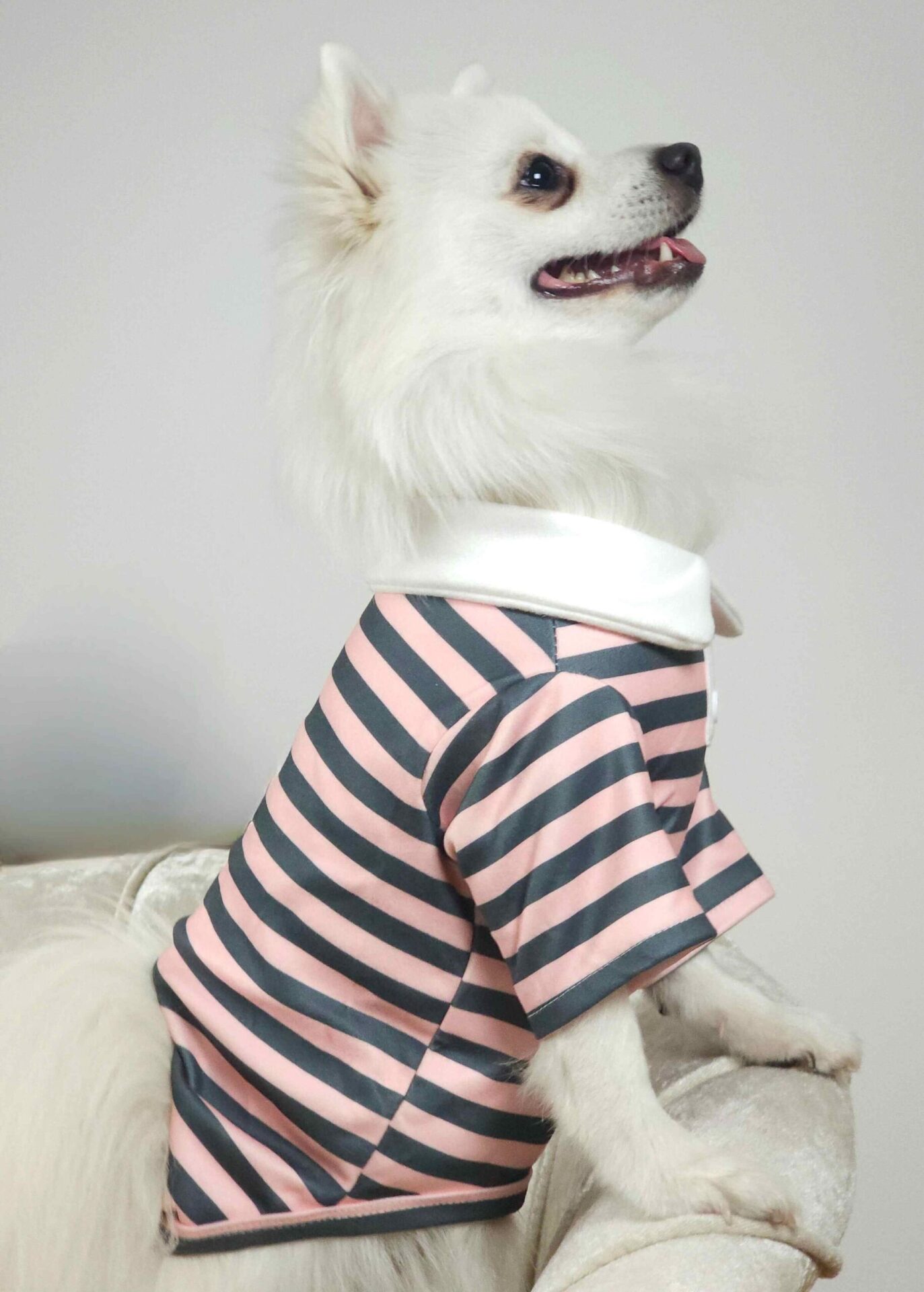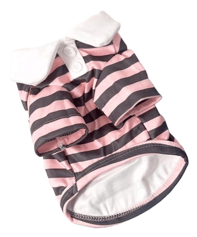 Αυτό το ροζ  Μπλουζάκι Για Σκύλους  είναι ένα απόλυτα γλυκό και κομψό ρούχο για το αγαπημένο σας κατοικίδιο. Το μπλουζάκι έχει λεπτές, γκρι ρίγες που το κάνουν να ξεχωρίζει, ενώ ο λευκός γιακάς και τα μικρά λευκά κουμπάκια προσθέτουν μια δόση κομψότητας στο στυλ του. Είναι κατασκευασμένο από μαλακό ύφασμα, που εξασφαλίζει όχι μόνο την άνεση, αλλά και τη ζεστασιά για το κατοικίδιο σας.